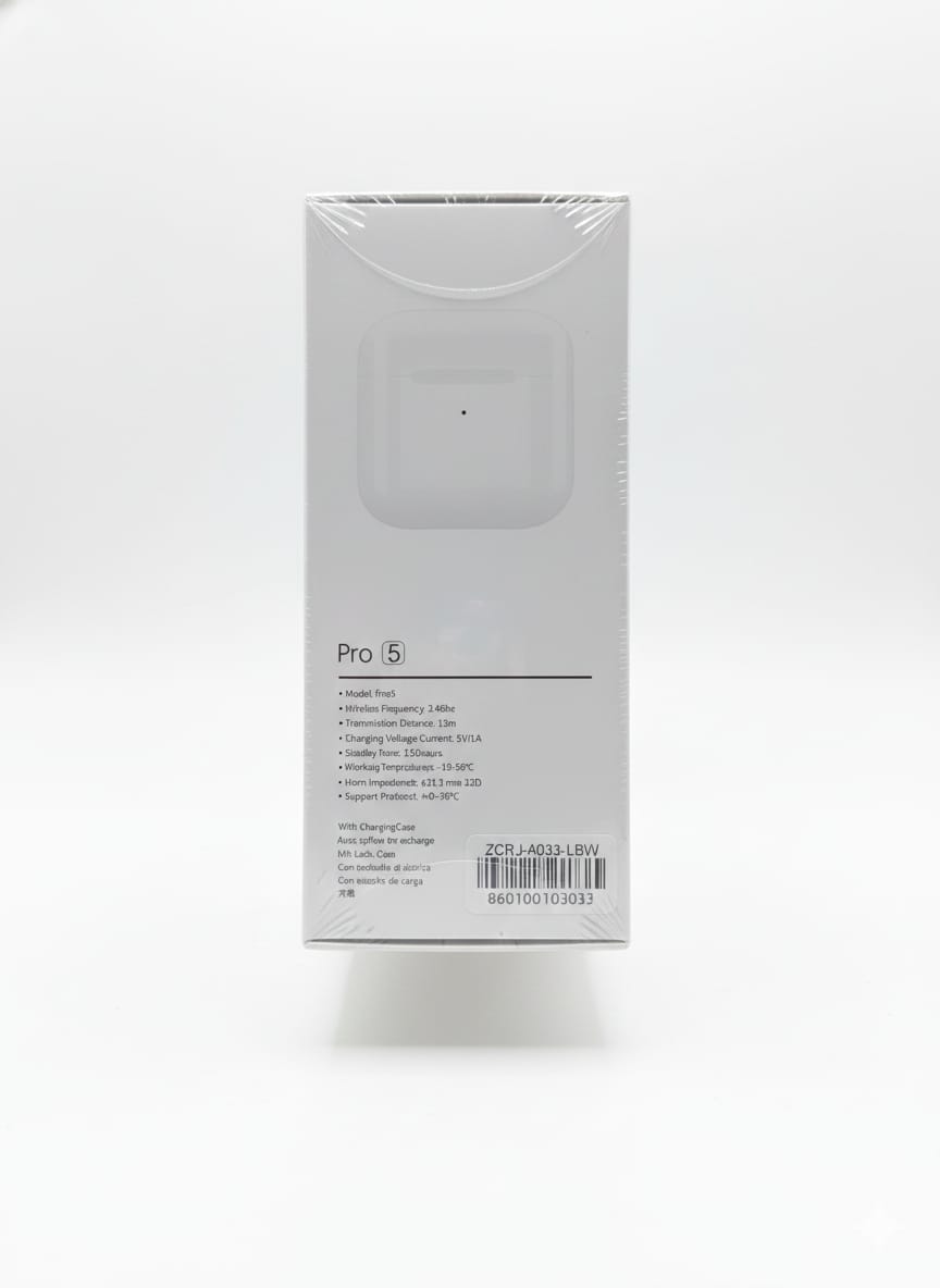 Auriculares inalámbricos Pro 5, diseñados para ofrecer sonido de alta calidad y comodidad excepcional. Con un diseño elegante y minimalista, estos auriculares se adaptan perfectamente a tus oídos para una experiencia de audio inmersiva.